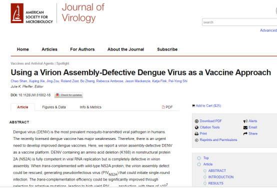 登革熱病毒(DENV)目前流行性最廣的通過蚊蟲傳播的病毒。登革熱病毒感染后可導(dǎo)致患者高熱,頭痛,肌肉、骨關(guān)節(jié)劇烈酸痛、部分患者出現(xiàn)皮疹、出血傾向、淋巴結(jié)腫大。該病毒主要在熱帶和亞熱帶地區(qū)流行,我國廣東、香港、澳門等地是登革熱流行區(qū)。目前,該病毒還沒有有效的商品化疫苗來預(yù)防。近日,來自武漢病毒研究所的科學(xué)家和美國的科學(xué)家合作,開發(fā)出了一種新的制備登革熱病毒疫苗毒株的方法,該研究成果目前已發(fā)表至《Journal of Virology》雜志,題為“Using a Virion Assembly-Defective Dengue Virus as a Vaccine Approach”。