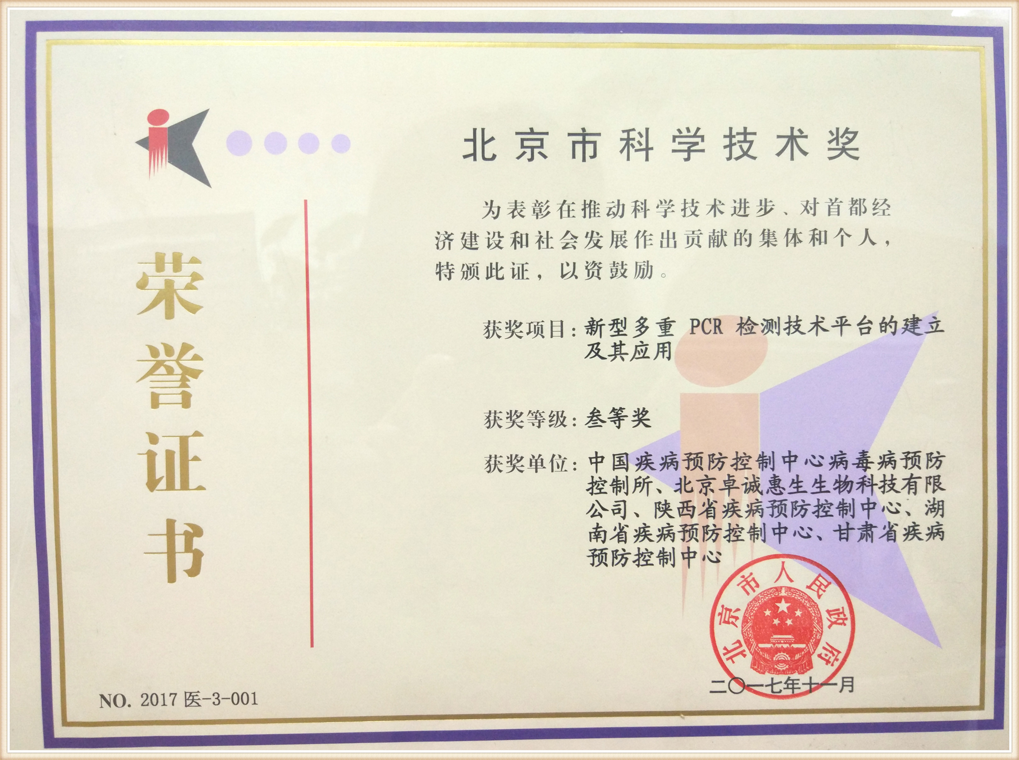 為表彰在2017年推動(dòng)科學(xué)技術(shù)進(jìn)步,對首都經(jīng)濟(jì)建設(shè)和社會(huì)發(fā)展作出貢獻(xiàn)的集體和個(gè)人,北京市人民政府于2017年11月為北京卓誠惠生參與完成的“新型多重PCR檢測技術(shù)平臺(tái)的建立及其應(yīng)用”項(xiàng)目頒發(fā)北京市科學(xué)技術(shù)獎(jiǎng)叁等獎(jiǎng),以資鼓勵(lì)。